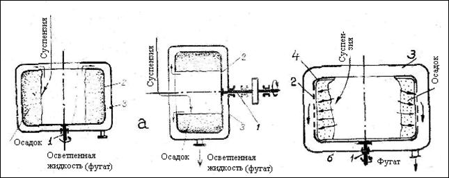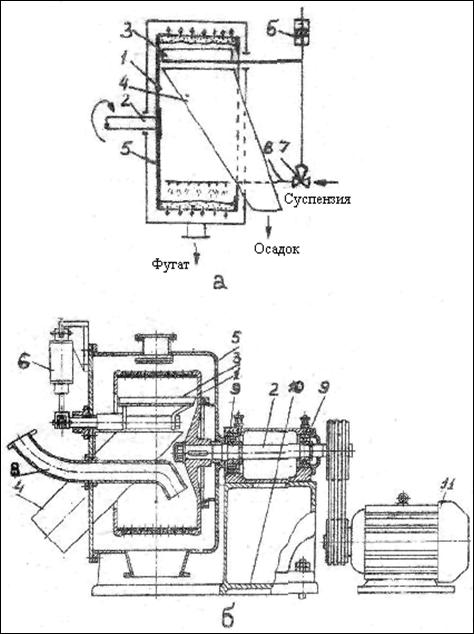 Рис. 52. Принцип устройства отстойной /а/ и фильтрующей /б/ центрифуг периодического действия с ручной выгрузкой осадка.