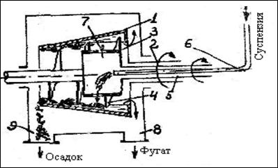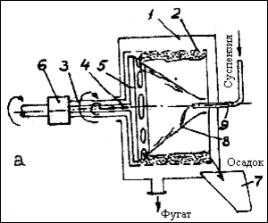 1. Конический отстойный барабан, вращающийся на полом внешнем валу 2 с постоянной скоростью. 3. Внутренний барабан с винтовыми /шнековыми/ лопастями 4, вращающийся на внутреннем полом валу 5 с несколько меньшей скоростью, чем отстойный барабан. 6. Труба для непрерывного подвода суспензии, которая через окна 7 во внутреннем барабане 3 поступает на отстаивание во внешний барабан. 8. Патрубок для удаления осадка, который медленно перемещается по внутренней поверхности барабана 1 лопастями шнека 4, вследствие неодинаковости скоростей вращения внешнего и внутреннего барабанов.