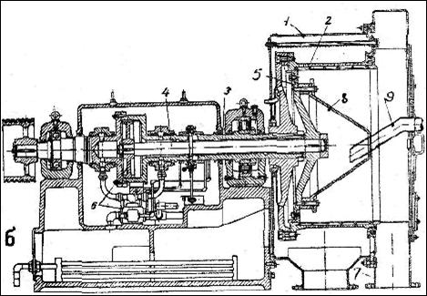 Рис. 46. Непрерывно действующая фильтрующая центрифуга с выгрузкой осадка пульсирующим поршнем: устройство /а/ и разрез /б/.