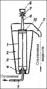 1. Ввод суспензии. 2. Переливной желоб 3. Успокоительная камера. 4. Конические тарелки. 5. Воронки для сбора осветленной жидкости. 6. Вывод осветленной жидкости. 7. Гребок для выгрузки шлама. 8. Шнек для транспортировки шлама. 9. Вывод шлама.
