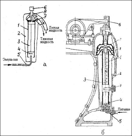 Рис. 49. Трубчатая сверхцентрифуга для непрерывного разделения тонкодисперсионных эмульсий: устройство /а/ и разрез /б/.