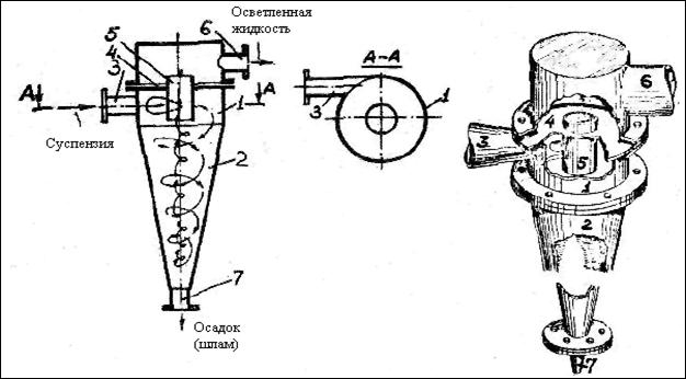 1. Цилиндрическая часть корпуса. 2. Коническая часть корпуса. 3. Тангенциальный ввод суспензии. 4. Перегородка. 5. Патрубок. 6. Вывод осветленной жидкости. 7. Вывод шлама.