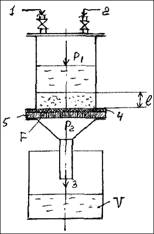 1 – суспензия, 2 – сжатый воздух, 3 – фильтрат, F – сечение фильтра, l – высота слоя осадка, p1, p2 – давление, V – объем полученного фильтрата, 4 – ткань /сукно/, 5 – дырчатый диск.