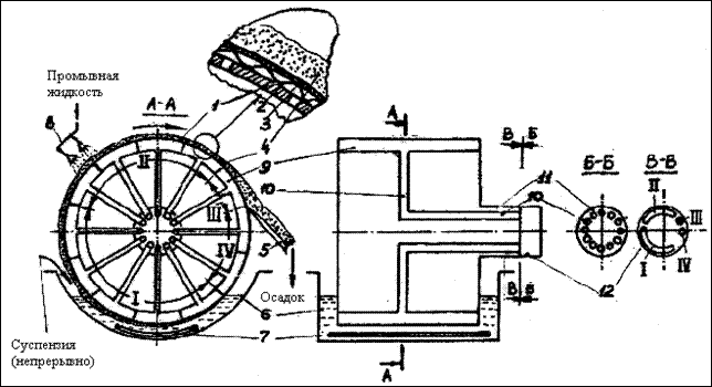 сетка. 3. Фильтровальная ткань. 4. Осадок на барабане. 5. Нож для съема осадка. 6. Корыто для суспензии. 7. Качающаяся мешалка. 8. Устройство для подвода промывной жидкости. 9. Камеры барабана. 10. Трубы, объединенные во вращающуюся часть 11 распределительной головки, поочередно соединяющие камеры 9 барабана 1 с секциями неподвижной части 12 распределительной головки.