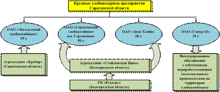 В процессе исследований выявлены организационно-экономические предпосылки развития агрохолдингов в регионе. Полиаспектный анализ показал, что на основе развития кооперационно-интеграционных взаимоотношений в городах Саратов и Энгельс функционируют 4 крупных предприятия по производству хлебобулочных и кондитерских изделий при суточной производительности от 35 до 55 т. Все рассматриваемые предприятия хлебобулочного дивизиона являются субъектами агропромышленных формирований холдингового типа со статусом межрегиональных и региональных объединений.