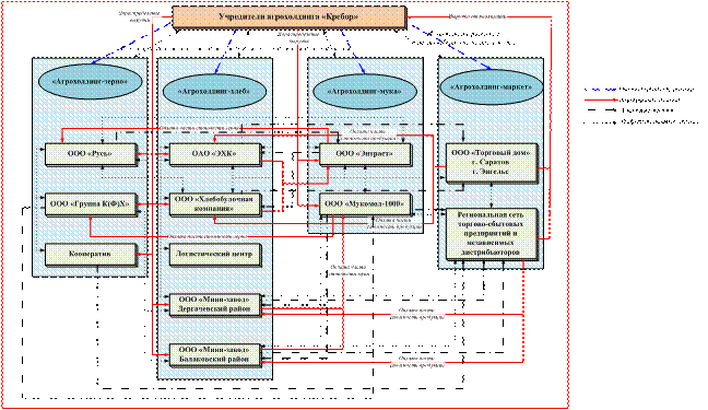 (рис. 6), включающая следующие подразделения – дивизионы бизнеса «Арохолдинг-зерно», «Агрохолдинг-мука», «Агрохолдинг-хлеб», «Агрохолдинг-маркет», которая позволит головной компании (учредителям) упорядочить производство, переработку, сбыт ввиду расширения масштаба ведения бизнеса, сделает прозрачным весь технологический процесс каждого дивизиона и будет способствовать более точному выбору перспективных направлений развития интеграционной группировки.