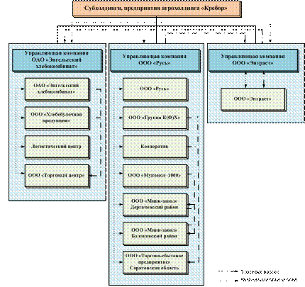 6. Для агрохолдинга «Кребор» разработана организационно-экономическая модель, основанная на расширении и углублении кооперационно-интеграционных взаимодействий за счет формирования новых структурных единиц в соответствии с технологической цепочкой вертикальной интеграции объединения, с выделенными дивизионами бизнеса: «Агрохолдинг-зерно», «Агрохолдинг-мука», «Агрохолдинг-хлеб» и «Агрохолдинг-маркет», а также предложена схема совершенствования взаимосвязей между субъектами объединения, предусматривающая образование субхолдингов, возглавляемых управляющими компаниями, применение которой позволит получить синергетический эффект. Задачей субхолдингов является достижение внутренней сбалансированности ресурсного потенциала объединения.
