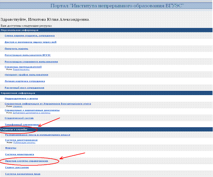 1. Шаг 1 - Войти в «Простую систему справочников». Для этого нужно через официальный сайт ВГУЭС зайти в портал. Далее среди доступных ресурсов найти раздел «Сервисы и службы», через него войти в «Простую систему справочников» (см. рис. 1).