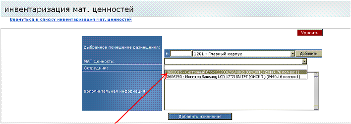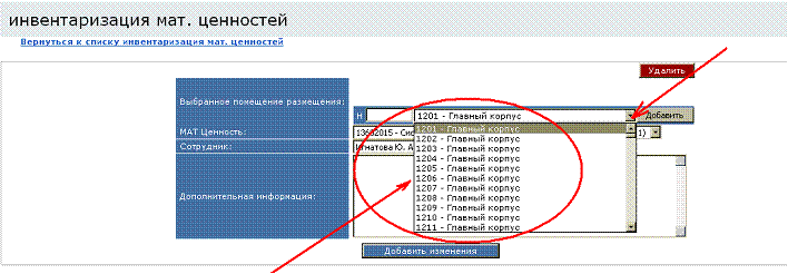5. Шаг 5 - Работа со списком мат. ценностей. Раскрывающийся список «МАТ Ценность» отображает материальные ценности, находящиеся в вашей ответственности. Откройте список с помощью кнопки, как показано на рисунке 5. Мат. ценности и из этого списка нужно привязать к помещениям их расположения. Если список пуст, значит за вами не числятся мат. ценности либо они внесены в справочник ранее.