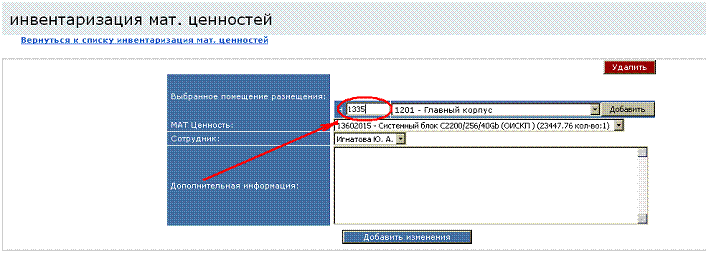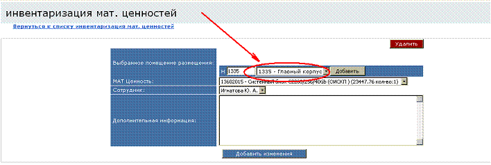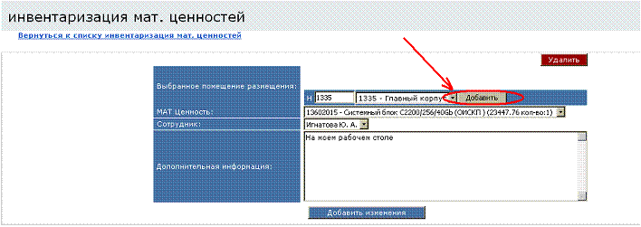 10. Шаг 10 – Привязать помещение к мат. ценности. Для этого нужно нажать кнопку добавить, как показано на рисунке 10.