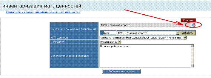 12. Шаг 12 - Редактирование привязки помещений. Если вышла ошибка в привязывании аудитории (не тот номер), нужно удалить неправильные данные. Для этого есть кнопка, показанная на рисунке 13, при нажатии на которую неправильные данные будут удалены.
