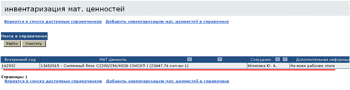 16. Шаг 16 – Убедиться в том, что запись появилась в справочнике. Для этого нужно сравнить то, что отображается на вашем экране с рис. 16 – в справочнике «Инвентаризация мат. ценностей» появилась вновь созданная запись.