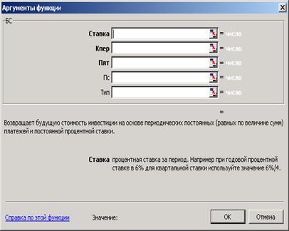 Синтаксис: БС (ставка; кпер; выплата; нз; тип).