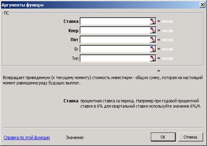 Финансовая функция ПЗ (ПС), отображенная на рисунке 3.5, предназначена для расчета текущей стоимости как единой суммы вклада (займа), так и будущих платежей (фиксированных и периодических). Этот расчет является обратным к определению будущей стоимости функцией БЗ.