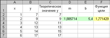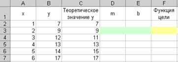 Для решения этой задачи отведем под переменные m и b ячейки D3 и ЕЗ, соответственно, а в ячейку F3 введем минимизируемую функцию {=СУММКВРАЗН(В2:В7;E3+D3*A2:А7)}.