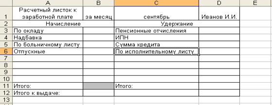 Удержание по исполнительному листу производится в ячейке D6 по формуле: =ПроцентВыплатПоИсполЛисту*(Доход за текущий месяц– ИПН).