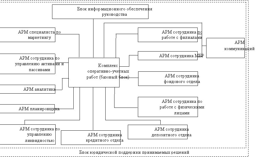 В предложенной схеме имеются АРМ, которые необходимы относительно полноценности управления, но отсутствуют как самостоятельные в большинстве БИС: АРМ специалиста по маркетингу, АРМ сотрудника по управлению пассивами и активами, АРМ аналитика, АРМ планировщика, АРМ сотрудника управления ликвидностью и др.
