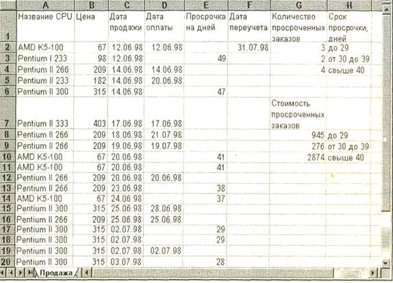 Дадим пояснения к третьей из этих формул. Excel в формуле массива возвращает условие (Е2:Е20>=40) в виде массива, состоящего из 0 и 1, где 0 стоит на месте ячейки со значением меньше 40 и 1 - на месте ячейки со значением не меньше 40. Следовательно, данная формула вычисляет сумму произведений элементов массива (Е2:Е20>=40) (С единицами в случае просрочки на указанный срок и нулями - в противном случае) и массива В2:В20 (с ценами процессоров).