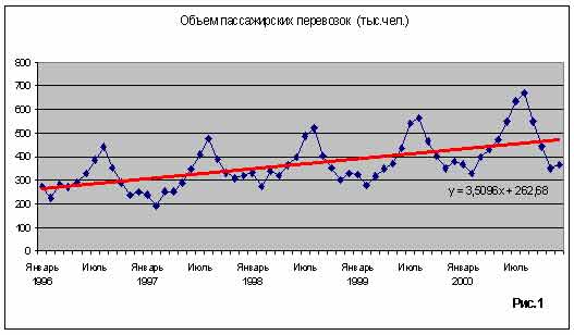 На рис.1 представлены данные об объемах пассажирских перевозок в авиакомпании с 1996 по 2000г. Из графика хорошо видно, что объем пассажиропотока имеет во времени возрастающий тренд и в ряде имеется ежегодно повторяющаяся закономерность – сезонность. Пик перевозок из года в год приходится на август, минимальный пассажиропоток – на февраль. Структура перевозок по месяцам сохраняется каждый год, т. е. период сезонности равен 12.