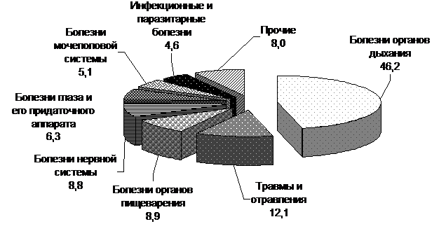 В структуре общей заболеваемости на первом месте стоят болезни органов дыхания – 30,7% и составляют 320,9‰. Мальчики болеют чаще девочек в 1,4 раза (373,6 против 262,7‰). На втором месте у мальчиков стоят болезни органов пищеварения (15,1%) и составляют 162,3‰ (у девочек 121,6 ‰). У девочек второе место занимают болезни мочеполовой системы (14,0%) и составляют 141,5‰, что в 2,7 раза выше, чем у мальчиков, и в 1,7 раза выше среднего уровня заболеваемости в России (79,8 ‰). Третье место в структуре накопленной заболеваемости у лиц обоего пола занимают болезни глаз и его придаточного аппарата (10,3%) и составляют 107,5‰. Четвертое место в структуре заболеваемости у мальчиков занимают болезни нервной системы (7,5%) и составляют 80,4‰. У девочек, как и у лиц обоего пола, болезни данного класса занимают пятое место (7,6%) и составляют 79,6 ‰.