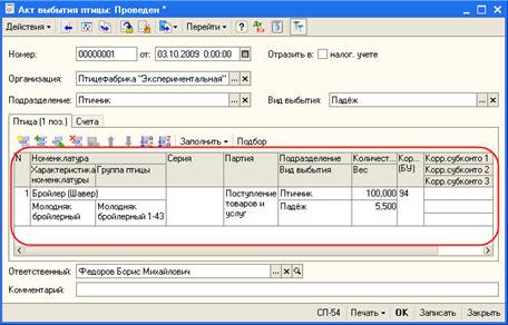 С целью наглядной демонстрации расхождений в остаточной стоимости при расчете стоимости выбывшей птицы обоими способам рассмотрим пример, реализованный в программе «1С:Бухгалтерия птицефабрики 8».