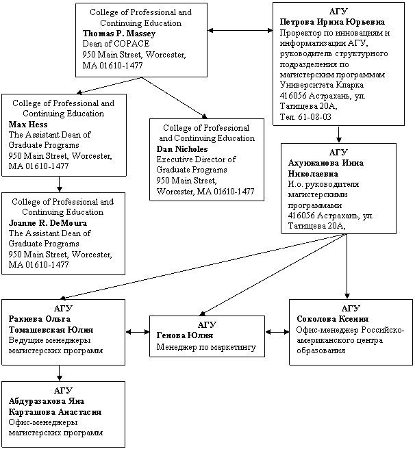 Директор отдела магистратуры Университета Кларка (или его/ее заместитель) является координатором Программы. Занятия проводятся в Астраханском государственном университете и на территории Университета Кларка в США.