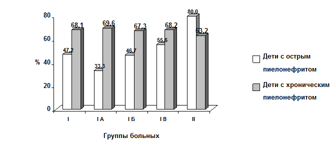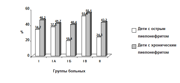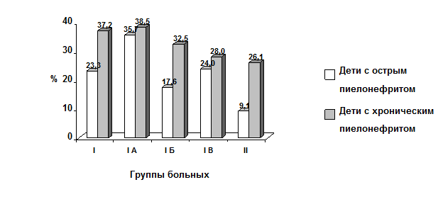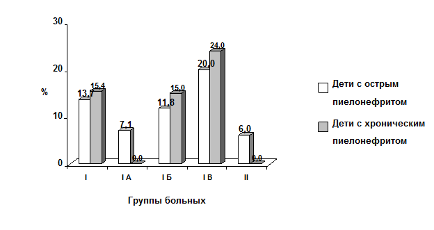 Рис. 2. Распределение групп ЧБД среди детей с острым и хроническим пиелонефритом.