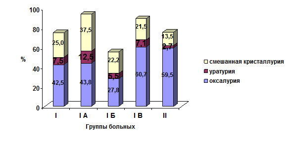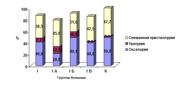 Рис. 6. Частота и характер кристаллурии у детей исследуемых групп с хроническим пиелонефритом.