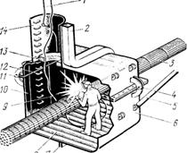 При выполнении сварочных работ на глубине свыше 12 м монтаж и использование шахтного колодца затруднительны. В этом случае ремонтные работы целесообразно выполнять с использованием подводной камеры, представляющей собой кессон без днища, которое заменено металлической решеткой. На торцовых стенках камеры имеются фланцы для крепления обойм уплотнений. В верхней части камеры имеется шлюз для входа в камеру и приемное устройство для ввода воздушных шлангов, шлангов от газогенераторной установки, сварочных кабелей, осветительного и телефонного кабелей, а также шлангов гидравлической системы. На верхних образующих камеры шарнирно закреплены панели с жесткими раскосами для установки на них балластных контейнеров, заполняемых грунтом. Опорами панелей служат установленные на грунт дна винтовые домкраты, опирающиеся на круглые подпятники с шинами.