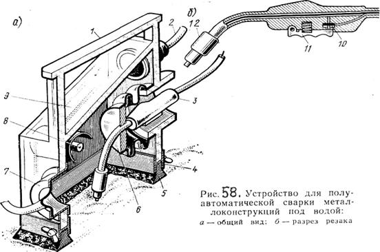 Портативная камера (рис.58) состоит из жесткого прозрачного корпуса 9, изготовленного из органического стекла. В нижней части корпуса крепится одна из съемных головок 4, контур которой выполнен идентичным по форме поверхности свариваемой металлоконструкции. Эта головка снабжена резиновым водонепроницаемым уплотнением 5. Уплотнение прижимается к свариваемой поверхности и препятствует проникновению воды в камеру. В боковой части камеры имеется диафрагма 6 для размещения в ней сварочного пистолета 3. Диафрагма представляет собой гибкий резиновый - рукав, позволяющий свободно манипулировать сварочным пистолетом в пределах внутреннего объема камеры. К верхней части камеры прикреплен гибкий металлический шланг 2, предназначенный для отвода избыточного количества подаваемого в камеру инертного газа. Подачу газа в камеру осуществляют через патрубок 7, который расположен с противоположной стороны от диафрагмы сварочного пистолета. Через этот патрубок в камеру с поверхности подают смесь аргона с двуокисью углерода, которая прокачивается через весь объем камеры и, не влияя на характер электрической дуги, препятствует проникновению воды в камеру и способствует удалению газа, ухудшающего видимость. Внутри камеры расположен источник света 8, освещающий рабочее пространство перед зажиганием дуги и в перерывах между ее горением. Камера снабжена удобной наружной рукояткой 1, при помощи которой, ею можно управлять и перемещать одной рукой, оставляя вторую для управления сварочным пистолетом.