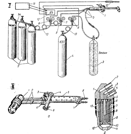 I— монтажная схема: 1 — резак; 2 — кислородные баллоны; 3— бензиновый баллон; 4 — азотный баллон; 5—шланги; 6 — пульт управления; 7— редуктор подогревательного кислорода; 8— редуктор режущего кислорода; 9 — азотный редуктор; 10 — электрозажигалка; 11— аккумулятор; 12—вольтметр; 13 — змеевик; 14 — коллектор; II — резак: а — общий вид; 1 — головка; 2 — соединительные трубки; 3 — вентиль подачи бензина; 4 — вентиль подачи режущего кислорода; 5 — рукоятка; 6 — ниппели; 7 — штуцеры; 8—вентиль подачи подогревающего кислорода; 9—средники для соединения головки с корпусом резака; б — разрез головкн; 1 — корпус: 2 — бензоподающая трубка; 3 —трубка режущего кислорода; 4 — трубка подогревающего кислорода; 5—сетчатая шайба; 6 — бензинорегулирующие стержни; 7—распылитель; 8—центральный канал; 9 — мундштук; 10 — выходные отверстия для кислорода; 11 —камера смешения; 12 — выходные отверстия для бензина; 13—охлаждающее кольцо.
