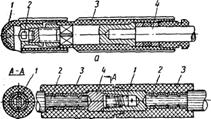 а — электрододержатель типа ЭПС-2: 1 — головка; 2 — контактный болт; 3 — корпус; 4 — кабель; б - соединительная муфта сварочного кабеля: 1 — штырь; 2— сварочный кабель; 3 — резиновая изоляция; 4 — гнездо-гайка.