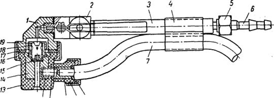 1 — корпус; 2—кислородный клапан с рычагом; 3— трубка; 4—обойма; 5, 9, 16 — накидные гайки; 6 — ниппель; 7 — сварочный кабель; 8—уплотнительная шайба; 10 — втулка; 11, 15, 17 — прокладки; 12—контакт; 13 — изоляционная чашка; 14 — головка; 18—искрогасительная камера; 19 — колпачок.