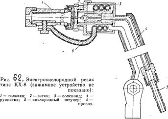Для управления подачей кислорода в дугу в электрододержателе предусмотрен кислородный клапан с рычагом, которым регулируется подача кислорода. В его головку введена искрогасительная камера, назначение которой состоит в том, чтобы предупредить загорание деталей головки электрододержателя при случайном попадании брызг расплавленного металла.