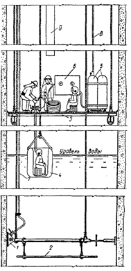 Pиc. 112. Cxeмa расположения оборудования в стволе шахты при наведении пластыря: 1 — пластырь; 2 — ходовая дорожка; 3 — рабочая площадка; 4 — корзина с водолазом; 5 — воздушные баллоны;