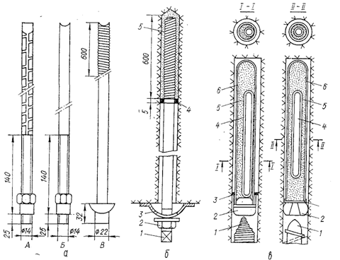 а — конструкции анкеров: А — периодического профиля; Б — из гладкой арматуры; В — с винтовой нарезкой; б — закрепление анкера в шпуре; / — зажимной конец; 2 —гайка; 3 —сферическая шайба; 4 — резиновое уплотнительное кольцо; 5 —нарезка; в — конструкция ампулы с синтетической закрепляющей композицией; 1 — заостренный конец арматурного стержня; 2 —пробка; 3 — кольцо из пенопласта; 4— ампула с отвердителем; 5 — смесь смолы и наполнителя; 6 —ампула.