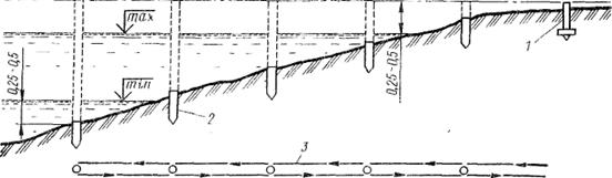 Верх береговой сваи должен быть выше предполагаемого максимального уровня воды на 0,25—0,5 м, а верх нижней сваи — на столько же ниже минимального уровня. Превышение промежуточных свай друг над другом для удобства наблюдений должно быть 0,2—0,6 м.