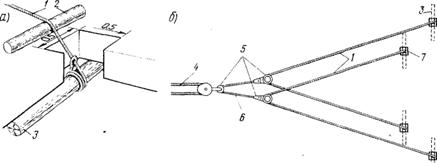 а — одинарная опора; б — анкерный куст с уравнительными блоками; 1 — анкерный канат; 2 — подкладка под канат; 3 — бревно; 4 — тяговый канат; 5 — уравнительные блоки; 6 — уравнительный канат; 7 — майны