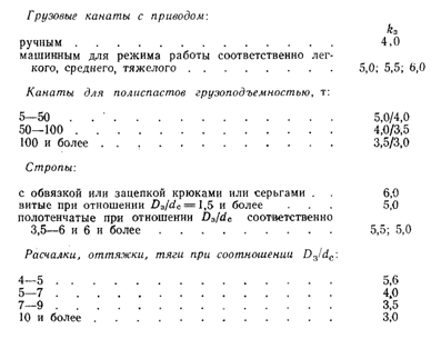3. Значения коэффициента k3 для канатов полиспастов приведены в числителе для отношения диаметров D/d ролика и каната 13—16, в знаменателе— для отношения 16 и более.