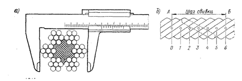 Рис. 124. Схемы измерения диаметра и шага свивки каната