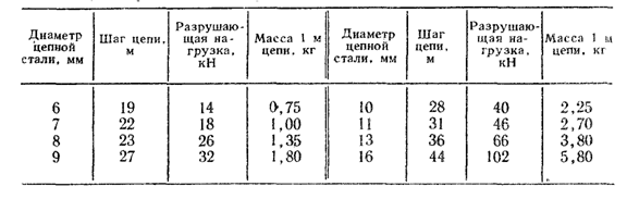 Для сварных и пластинчатых цепей допускаемое усилие (Н) на ветвь цепи S=R/k3 (где R —разрушающая нагрузка, Н).