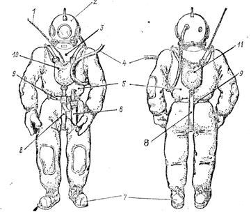 1-кабель-сигнал; 2-шлем; 3-манишка; 4-сигнальный конец; 5-водолазная рубаха; 6-нож; 7-водолазные галоши; 8-нижний брас; 9-пояс; 10-передний груз; 11-задний груз