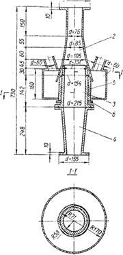Гидроэлеватор с кольцевой насадкой конструкции представлен на рис. 41 Кольцевая насадка образуется частью грани конической камеры смешения и коническим срезом всасывающей камеры. Ось насадки пересекается с осью гидроэлеватора под углом 16°.