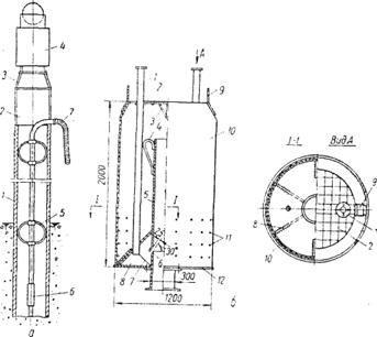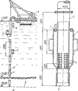 При погружении оболочек с помощью вибропогружателей для уменьшения силы трения грунта по внутренней поверхности и лобового сопротивления грунт из полости периодически удаляют при помощи эрлифтов (рис. 48,а) гидроэлеваторов, гидрожелонок.