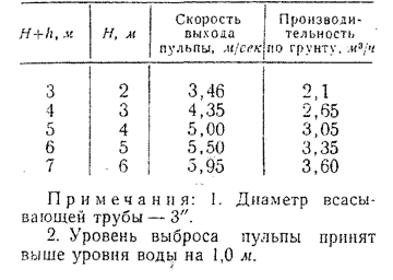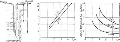 Применение эрлифтов целесообразно только при затопленном котловане и глубине воды в нем не менее 3 м. Наиболее высокая производительность их работы — на глубине свыше 8 м. На глубине 1,5—2 м производительность эрлифта практически равна нулю. Минимальную глубину погружения Н смесительной камеры эрлифта при подъеме пульпы на высоту h и расход воздуха для подъема 1 м3 пульпы можно определять по графикам (рис.43). Производительность эрлифтов зависит от давления воздуха и глубины погружения (табл. 16).