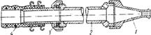 1— насадка со сменными соплами 12— 25 мм; 2 — труба с реактивными соплами: 3—накидная гайка; 4 — напорный шланг.