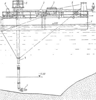 1—понтон; 2— насос ЗВ-200Х2; 3 — двигатель ЗД-12; 4 — напорная труба; 5 — лебедка; 1 тс; 6 — лебедка 3 тс; 7—насадка гидромонитора.