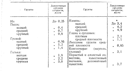 Таблица 18. Допустимые не размывающие скорости для различных грунтов