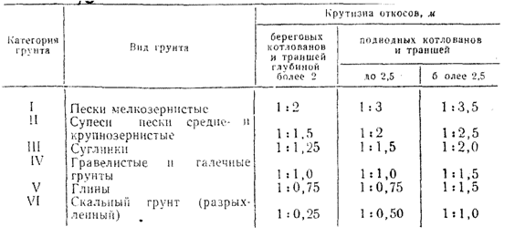 Примечание. Крутизна откосов, котлованов и траншеи на береговых участках учитывает наличие грунтовых вод.