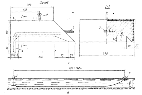 а — конструкция; б — схема установки; 1— железобетонный якорь; 2—подъемная петля; 3—рым; 4—шпора; 5— буй; 6 — поплавок.